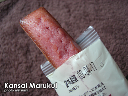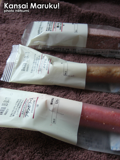 スティックフィナンシェのフランボワーズ味、メイプル味、スティックバームの紫芋味、の3本。フィナンシェだいすき♪