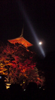 この日は満月に近いほど月が綺麗で晴天。三重の塔の横で輝く月とのコントラストにうっとり。とても幻想的な景色でした。紅葉の自然の美しさ当然綺麗でしたが、照らし出される建造物も負けてませんでした。