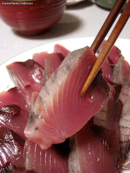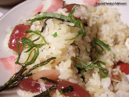 我が家のてこねはぶあつい鰹に紫蘇入り。