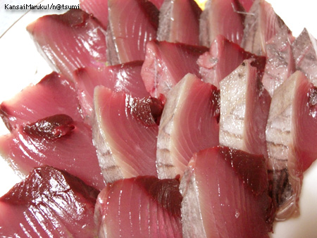 売っているものの多くは、すし飯の上にすきまなく漬け鰹がしきつめられ、きざみ海苔・しょうがをのせ、その上からゴマをぱらぱらとふってある。