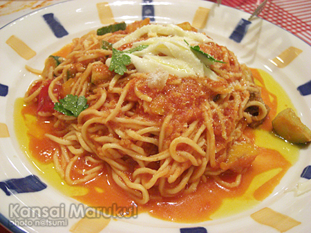 トマト味のパスタ。自家製パスタなのかちぎれまくり。