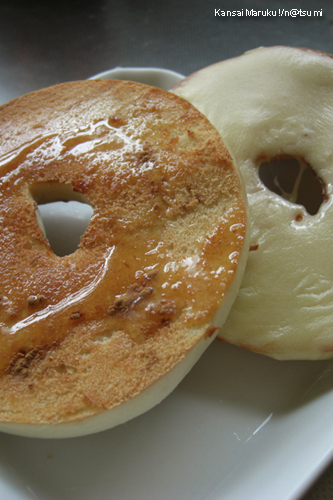 2枚に切り、ベーコンやレタスなどをはさんで食べるのが主流らしいですけど、ベーコンがあまり好きではないので、チーズ・ハニーシナモンで食べました★まず何も乗せないで若干焦げ目がつくぐらい焼いておいてから(バターは薄めに塗っておくとカリッとなる)チーズや、ハチミツを塗ります。そんでまた焼く。食べる頃にはとろーり、もっちーり♪