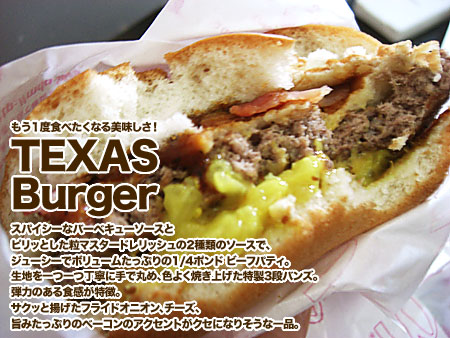 テキサスの荒野が目に浮かんでくるような、ワイルドな味わいのテキサスバーガー。スパイシーなバーベキューソースとピリッとした粒マスタードレリッシュの2種類のソースで、ジューシーでボリュームたっぷりの1/4ポンドビーフパティ(通常のビーフパティの約2.5倍)を、豪快にお楽しみください。
