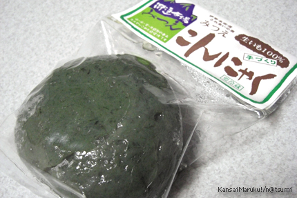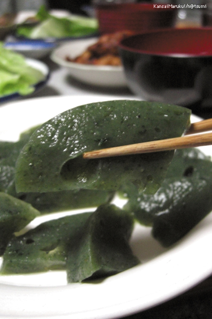 いつも食べてるこんにゃくとは違って、柔らかく、よもぎの風味が薫ります。