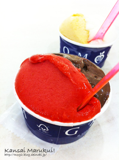 カップかコーンが選べます。味も2種選べるので列で待ってる間に決めます。が、優柔不断の私は結局レジに行ってから決める羽目に。迷ってたメロン、ミルクをなぜか断念。木いちごとビターチョコレートに決定。色合い可愛いー!