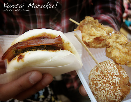 屋台の鶏のからあげと、サーダーアンダギー的なものと、豚の角煮的なサンド。角煮ぽいやつは「高菜が勝ちすぎて豚の味わからへん」言うてた。からあげうまい。